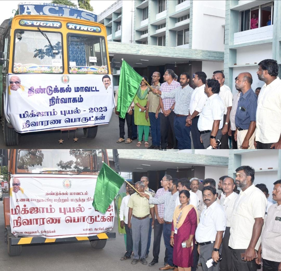 திண்டுக்கல் மாவட்ட நிர்வாகத்தின் சார்பில் ரூ.11 இலட்சம் மதிப்பிலான நிவாரண பொருட்கள் மாவட்ட ஆட்சியர் அலுவலகத்தில் இருந்து மாவட்ட வருவாய் அலுவலர் திரு.சேக்முகையதீன் லாரியில் கொடியசைத்து அனுப்பி வைத்தார்